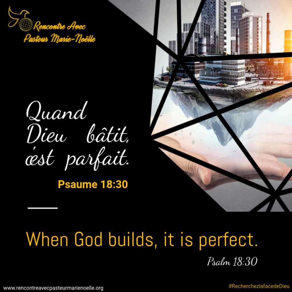Quand Dieu bâtit, c’est parfait: dans les fondations, dans le processus, dans le résultat et dans la durée. Laisse Dieu être le Bâtisseur de ta vie, de ton foyer, de ton ministère. Arrête de bâtir seul, et remets les plans entre Ses mains. Ce qu’Il fait est parfait, même si cela prend du temps, même si cela échappe à notre logique. Son œuvre est sûre et glorieuse.